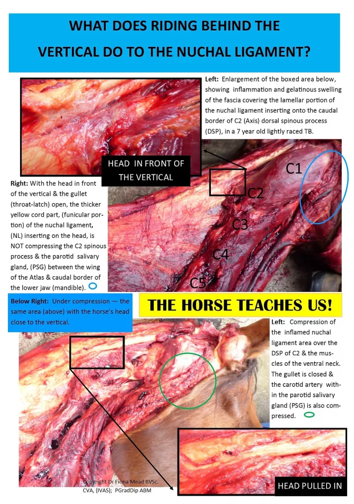In a recent dissection of a 7 year old lightly raced thoroughbred, who had had 8 starts and been head strong, with body issues that meant he had not been an easy ride, the effect of behind the vertical riding was HIGHLIGHTED. The owner had retired him because he had not looked comfortable ridden and was consistently pulled in, and tried to be controlled by his head placement.